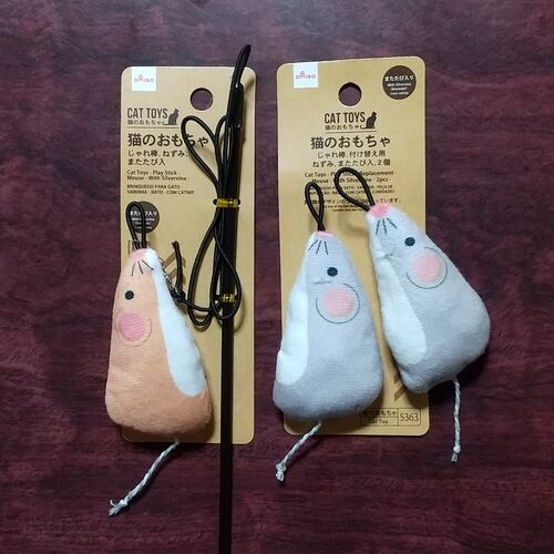 今日は午前中から雨でした☔ しかも冷たい雨で寒いです。 結構本格的に降っているので、パトロールが日課のちょび君は満足にパトロールに行けず、ご不満な様子。 そこで、少しでもストレス発散になればと思い、新しいおもちゃを開封。 ダイソーのおもちゃです…
